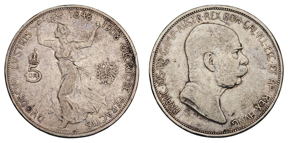 AUSTRIA 5 coronae 1908 / 60th Anniversary of the Reign of Franz Joseph I / Silver / VF