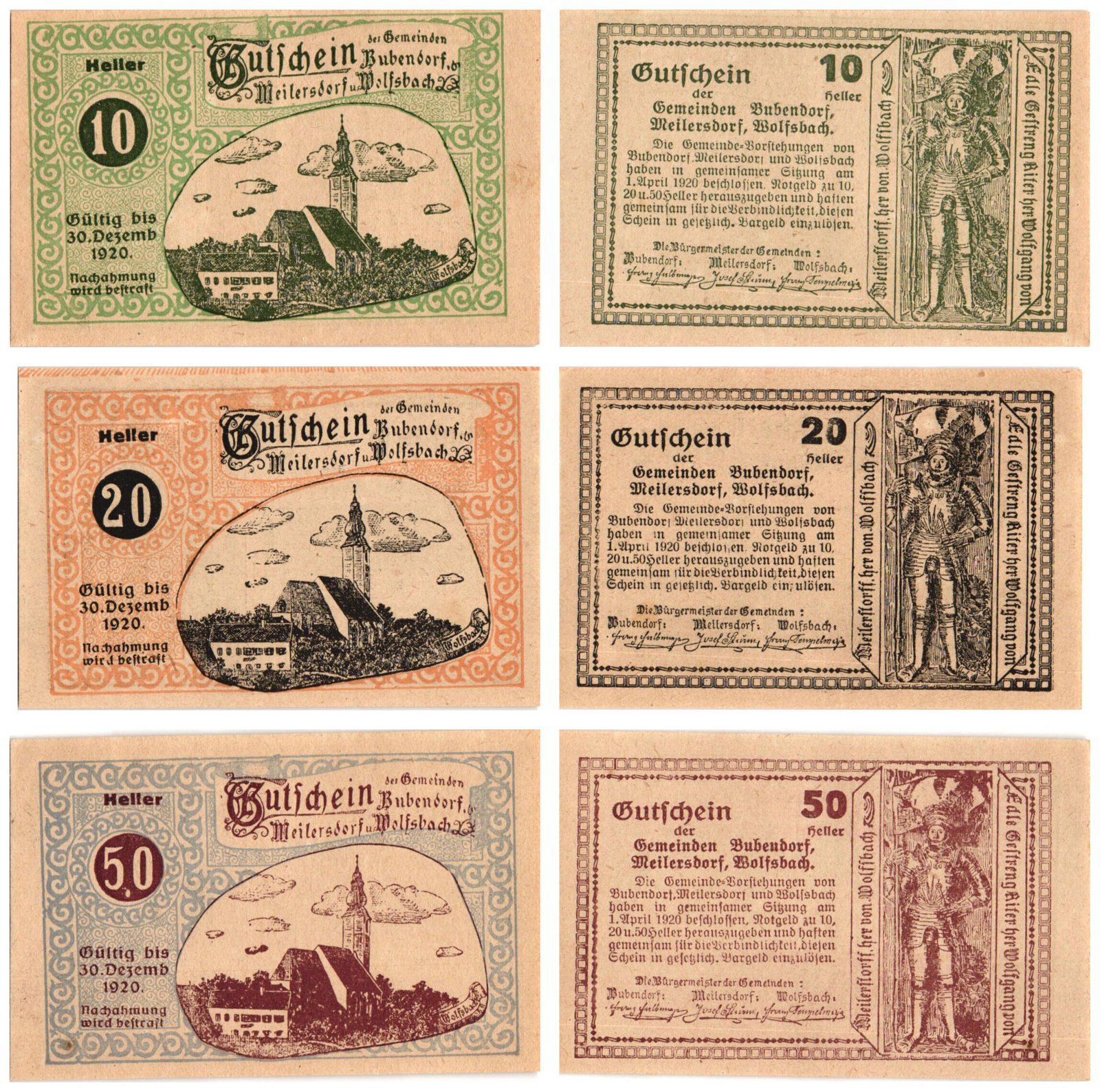AUSTRIA Bubendorf, Meilersdorf, Wolfsbach 1920 local banknotes lot / Notgeld / 3 pcs. UNC-