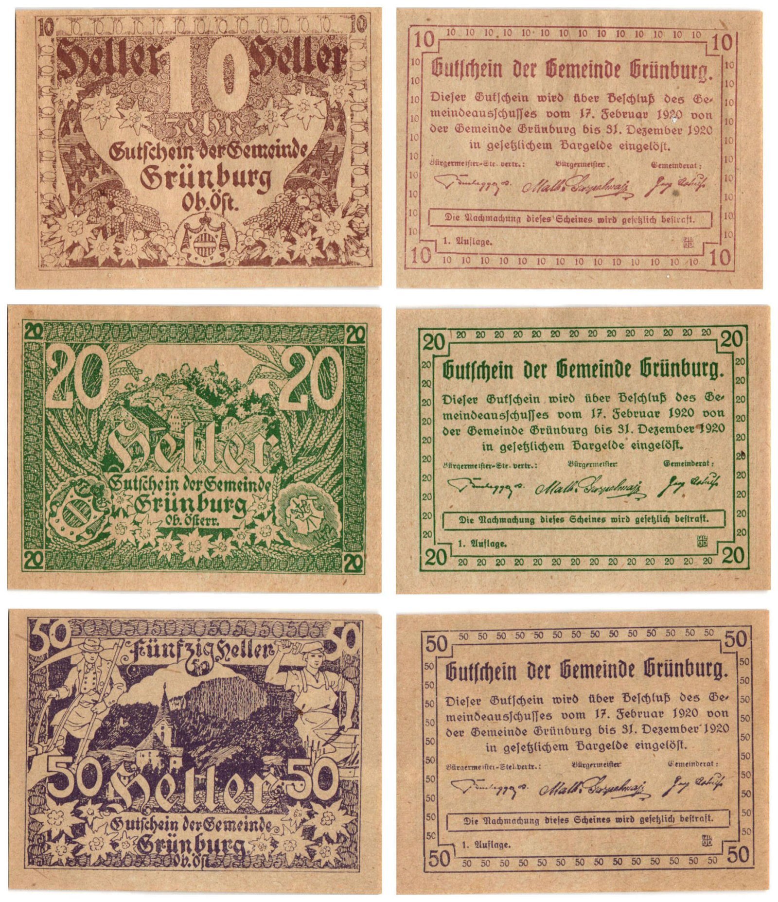 AUSTRIA Grünburg 1920 local banknotes lot / Notgeld / 3 pcs. UNC