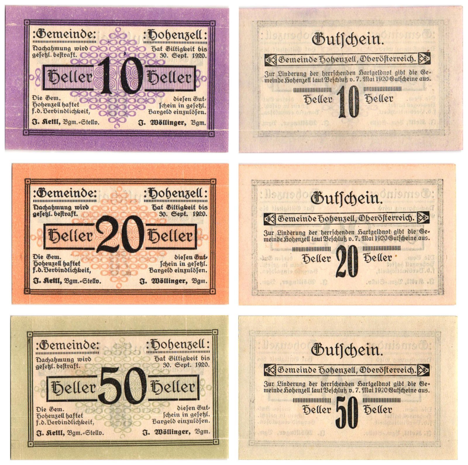 AUSTRIA Hohenzell 1920 local banknotes lot / Notgeld / 3 pcs. UNC