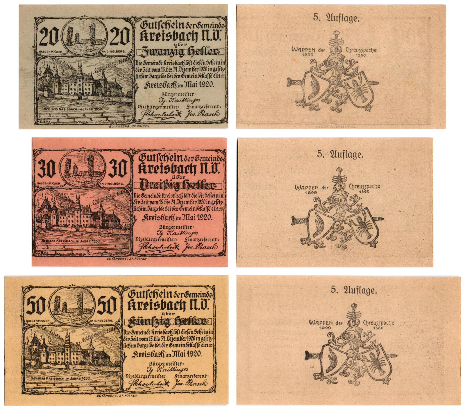 AUSTRIA Kreisbach (5. Auflage) 1920 local banknotes lot / Notgeld / 3 pcs. UNC
