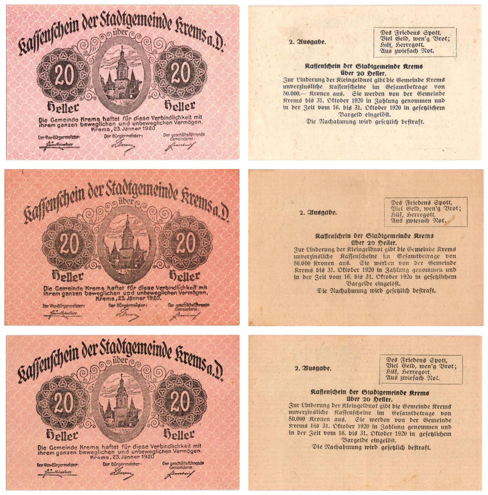 AUSTRIA Krems a. d. Donau 1920 local banknotes lot / Notgeld / 3 pcs. UNC