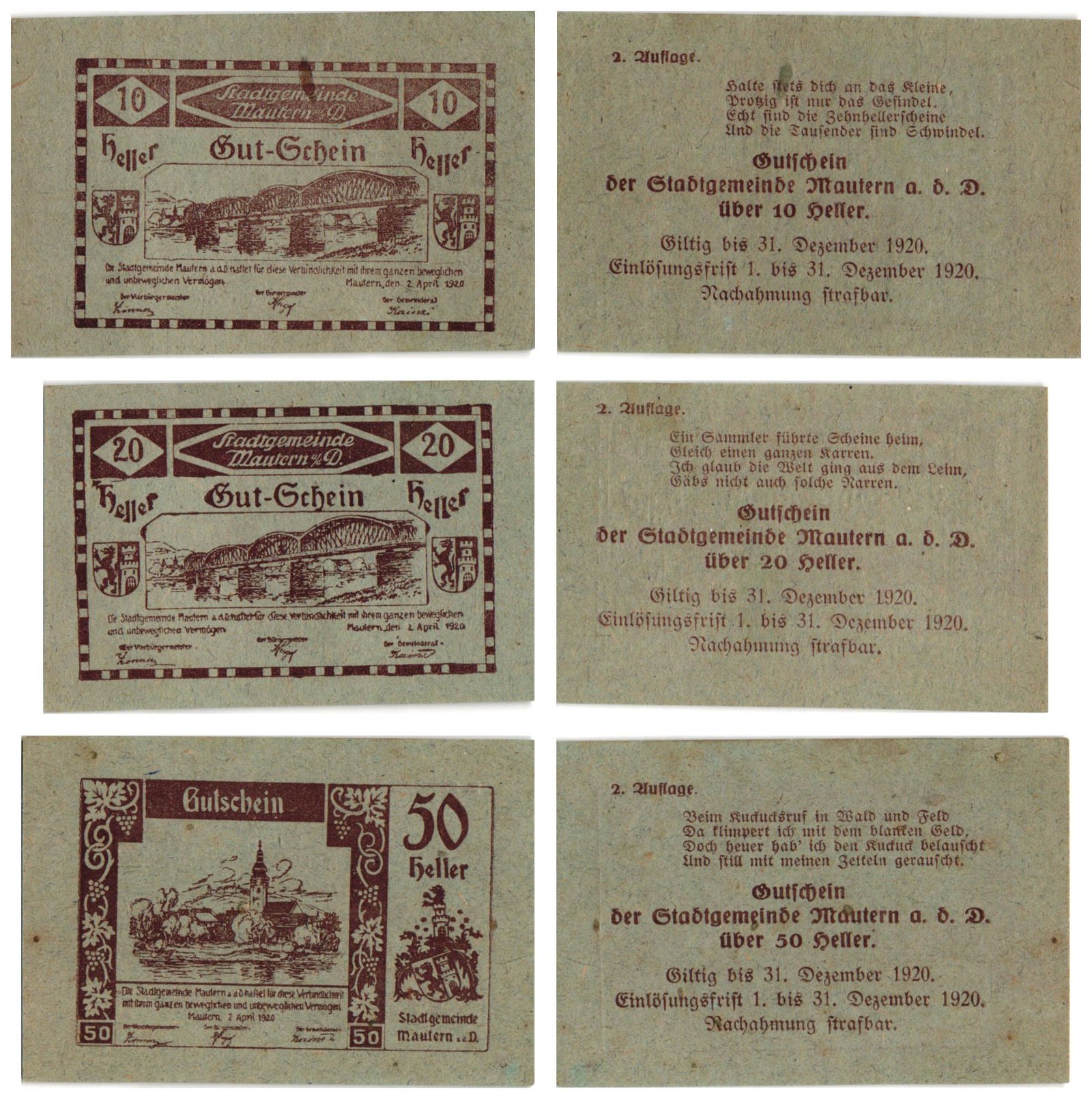 AUSTRIA Mautern an der Donau (Grey) 1920 local banknotes lot / Notgeld / 3 pcs. VF+