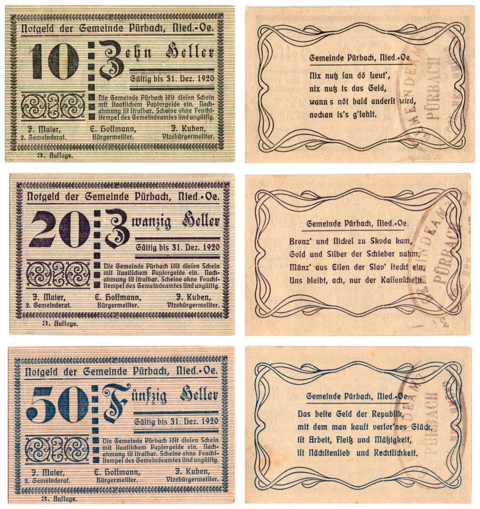 AUSTRIA Pürbach 1920 local banknotes lot / Notgeld / 3 pcs. UNC-
