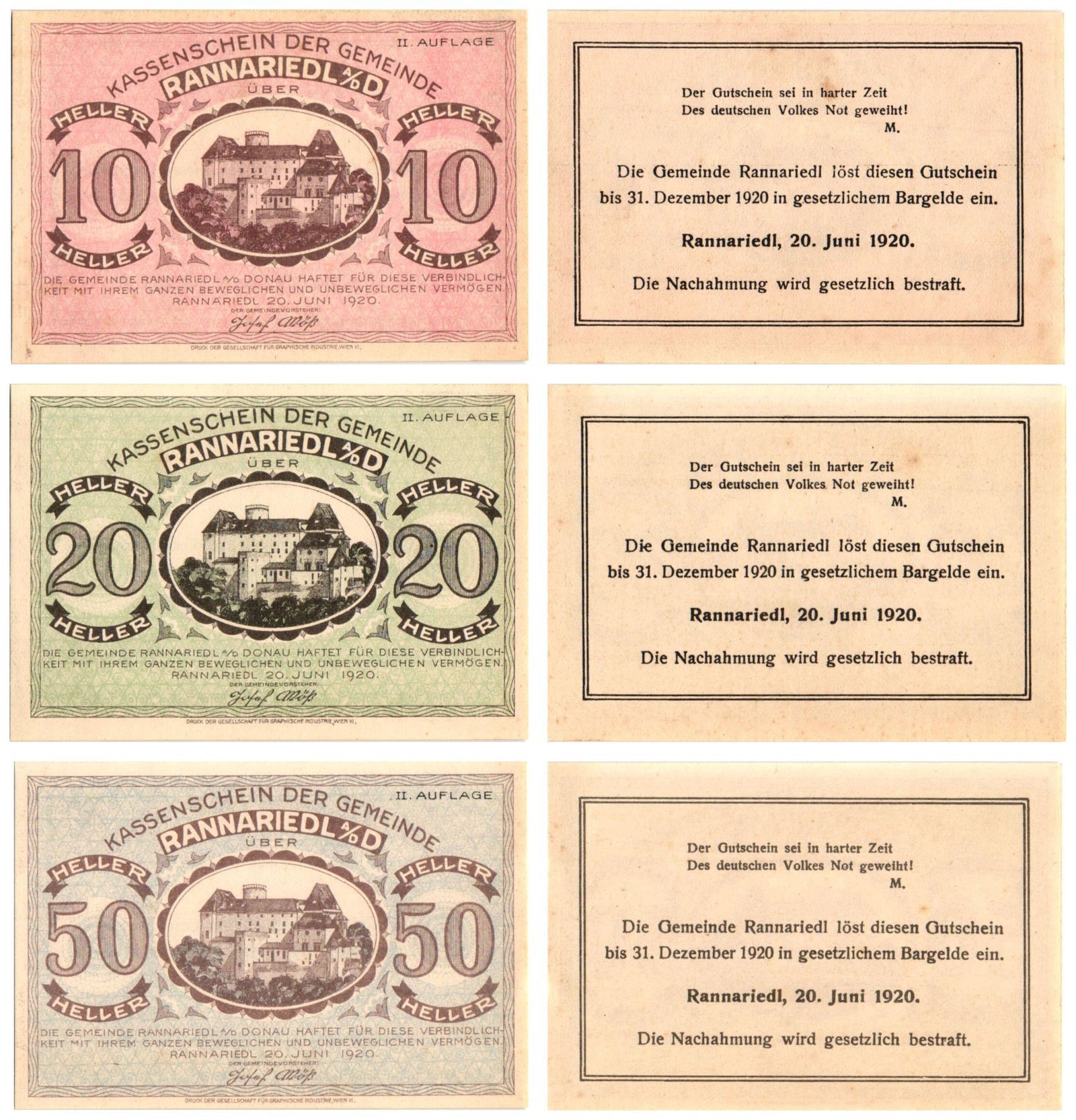 AUSTRIA Rannariedl an der Donau (II. Auflage) 1920 local banknotes lot / Notgeld / 3 pcs. UNC-