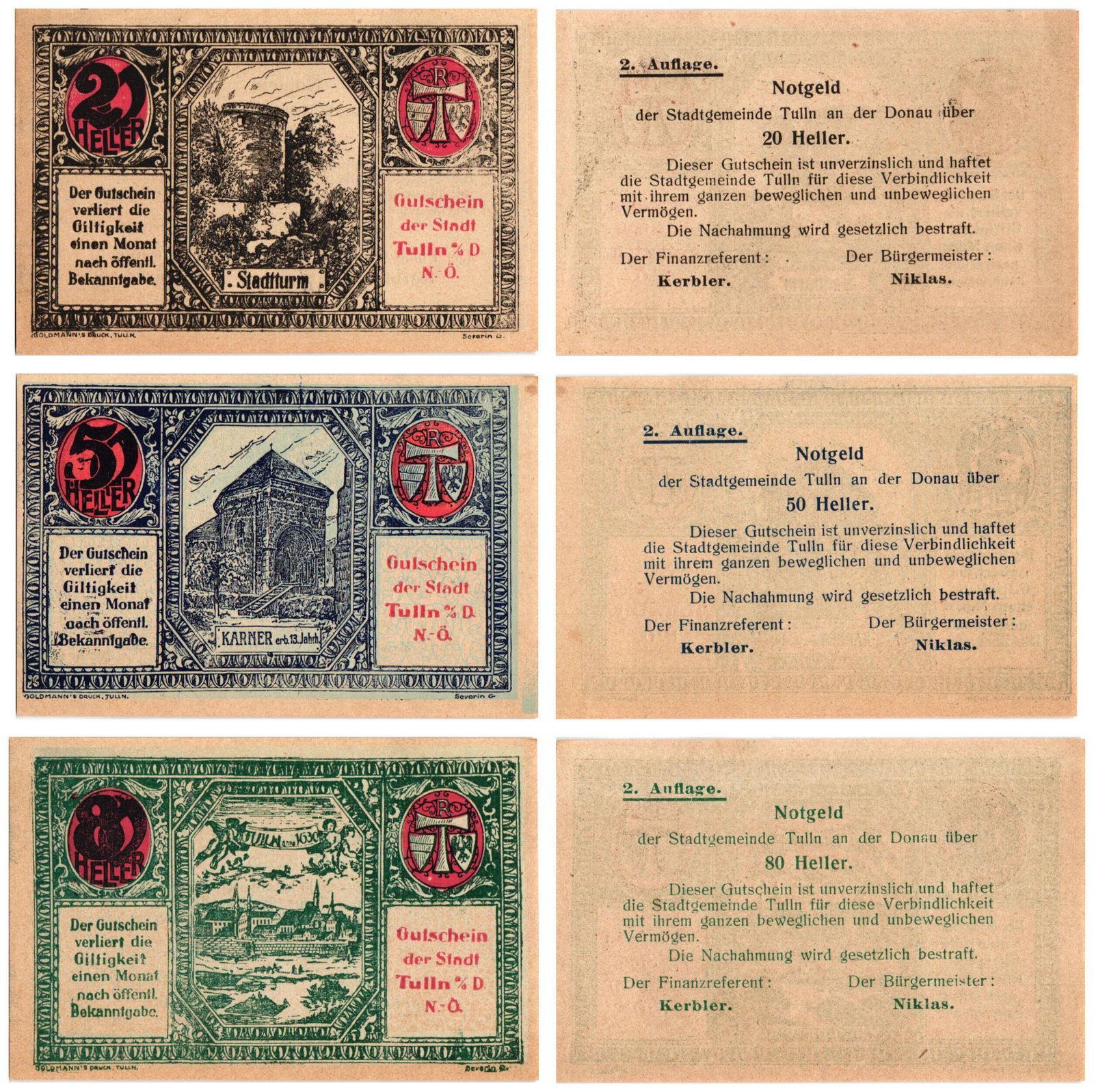 AUSTRIA Tulln an der Donau 1920 local banknotes lot / Notgeld / 3 pcs. UNC