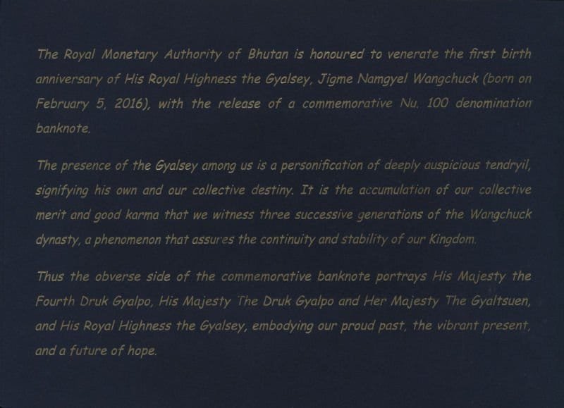 BHUTAN 100 ngultrum 2017 / Birth of Jigme Namgyel Wangchuk / UNC