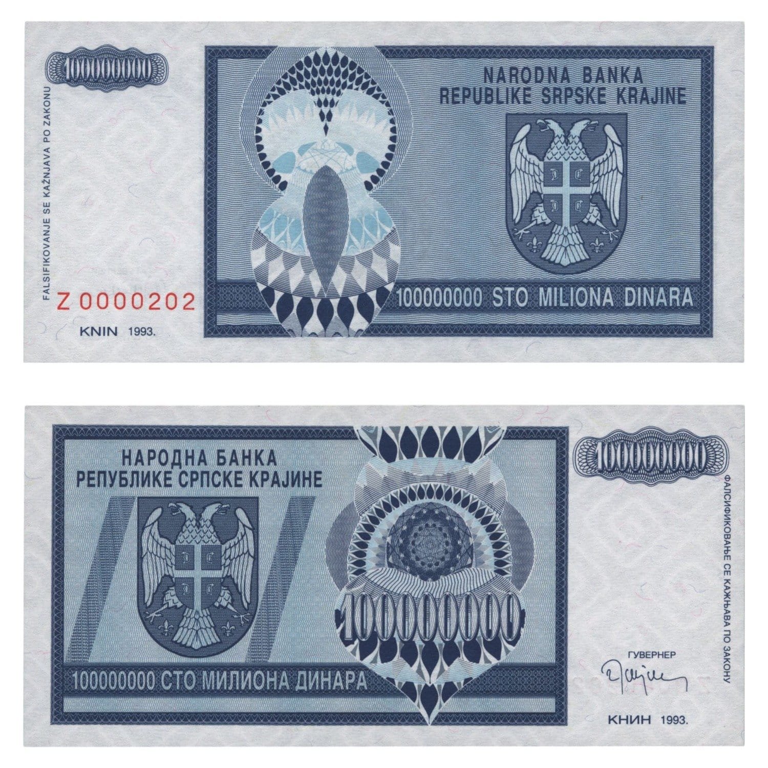 CROATIA 100 million dinara 1993 / Knin Krajina occupation issue / Replacement series Z / Low serial # / UNC