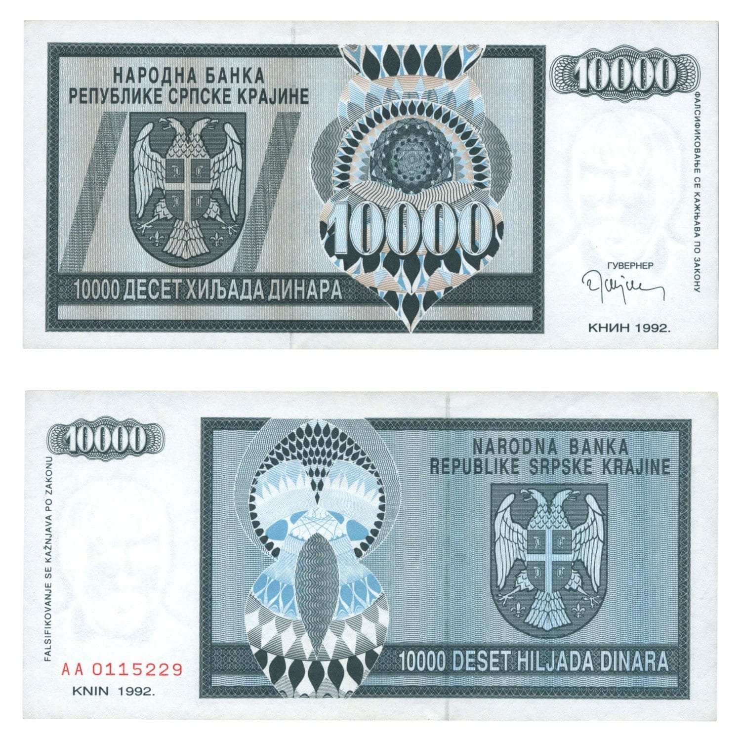 CROATIA 10000 dinara 1992 / Knin Krajina occupation issue / UNC-