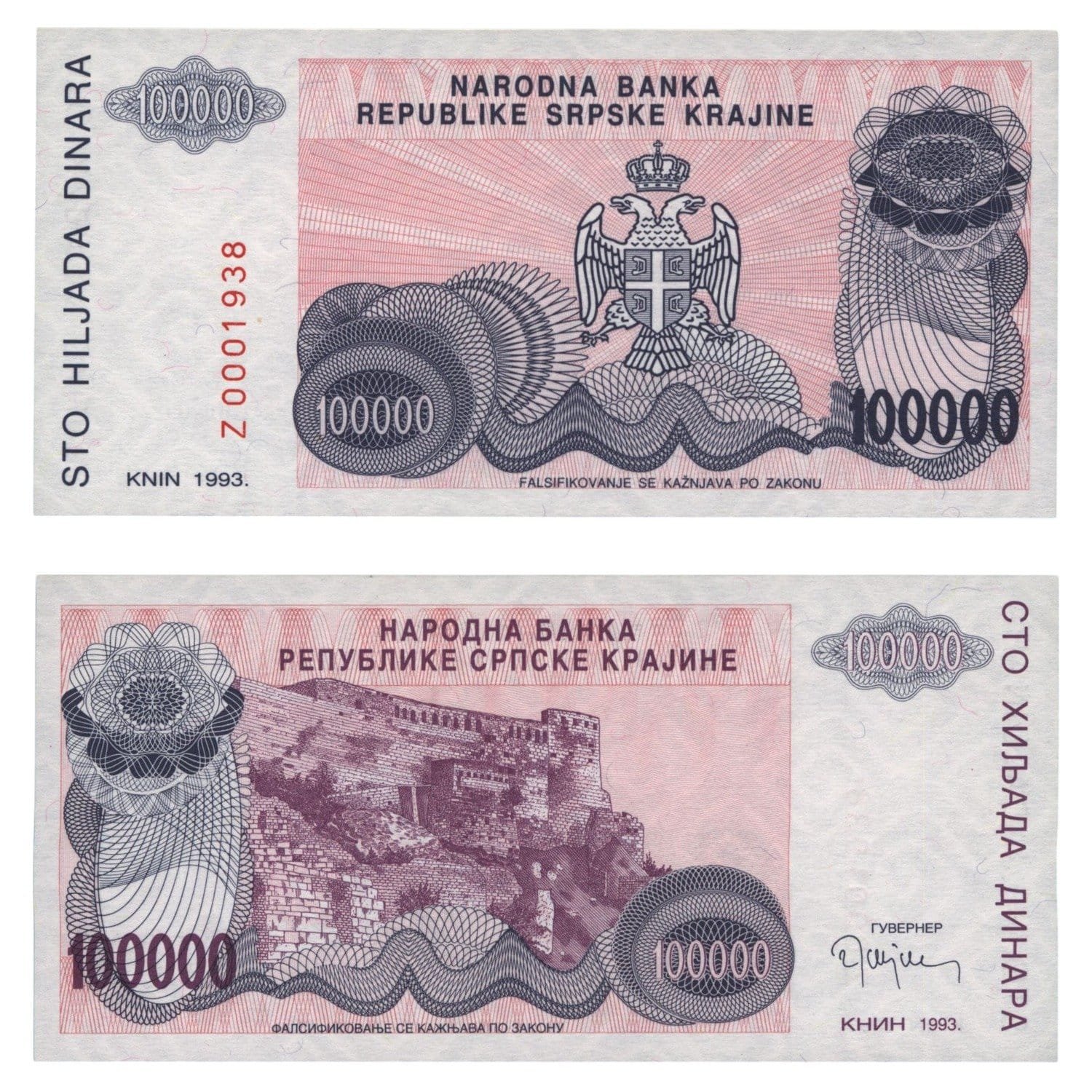 CROATIA 100000 dinara 1993 / Knin Krajina occupation issue / Replacement series Z / Low serial # / UNC