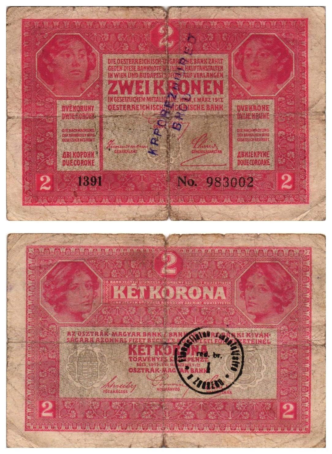 CROATIA 2 kronen ND(1919) / With seal Zagreb and fake seal Brod / F