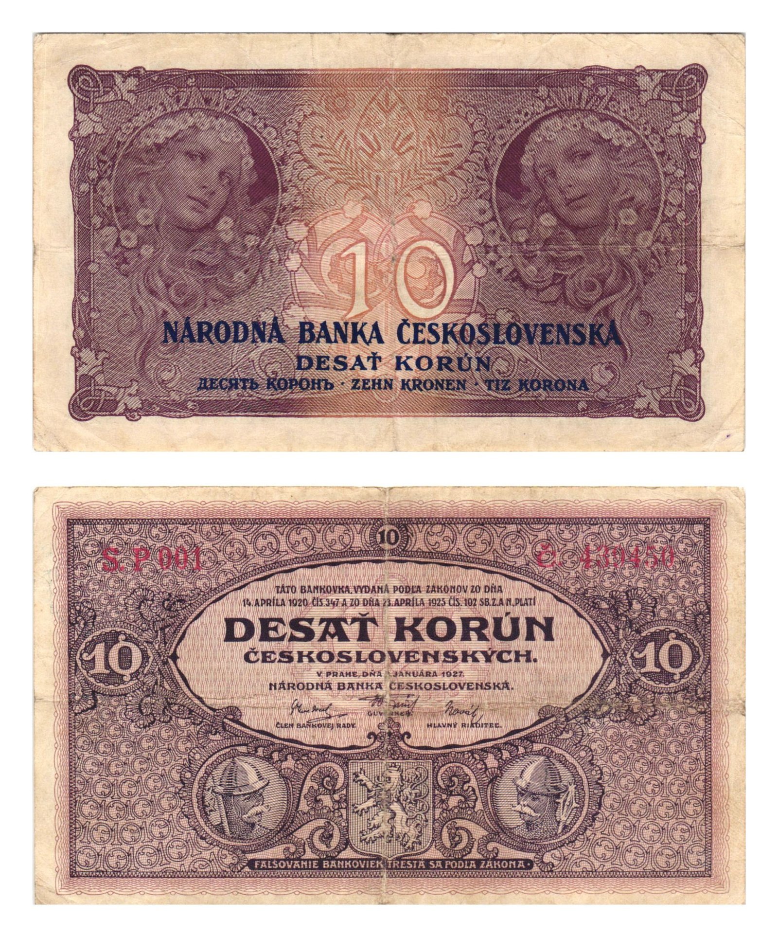 CZECHOSLOVAKIA 10 korun 1927 VF