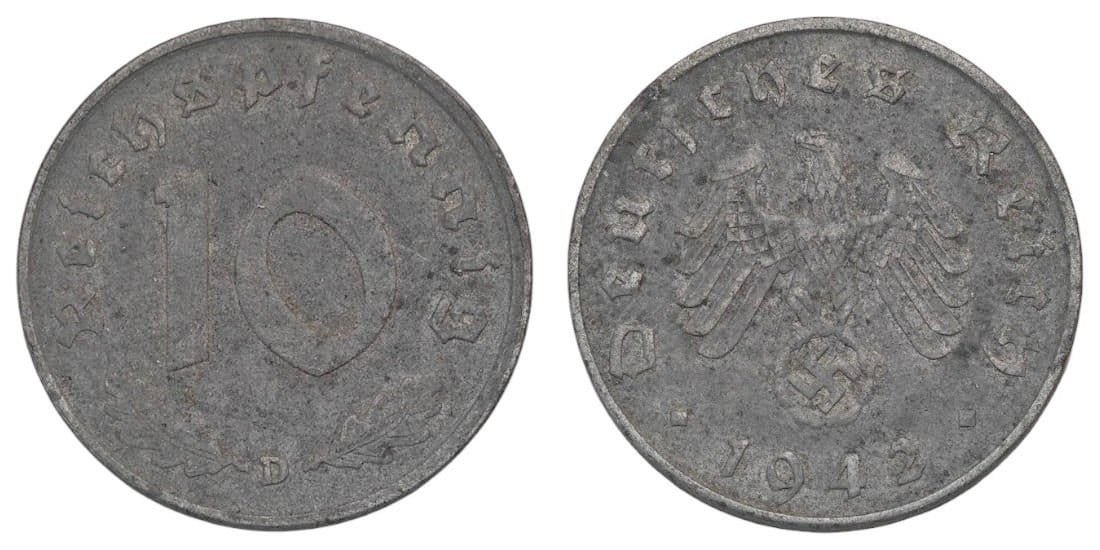 GERMANY 10 reichspfennig 1942D / 3rd Reich / WWII issue / VF
