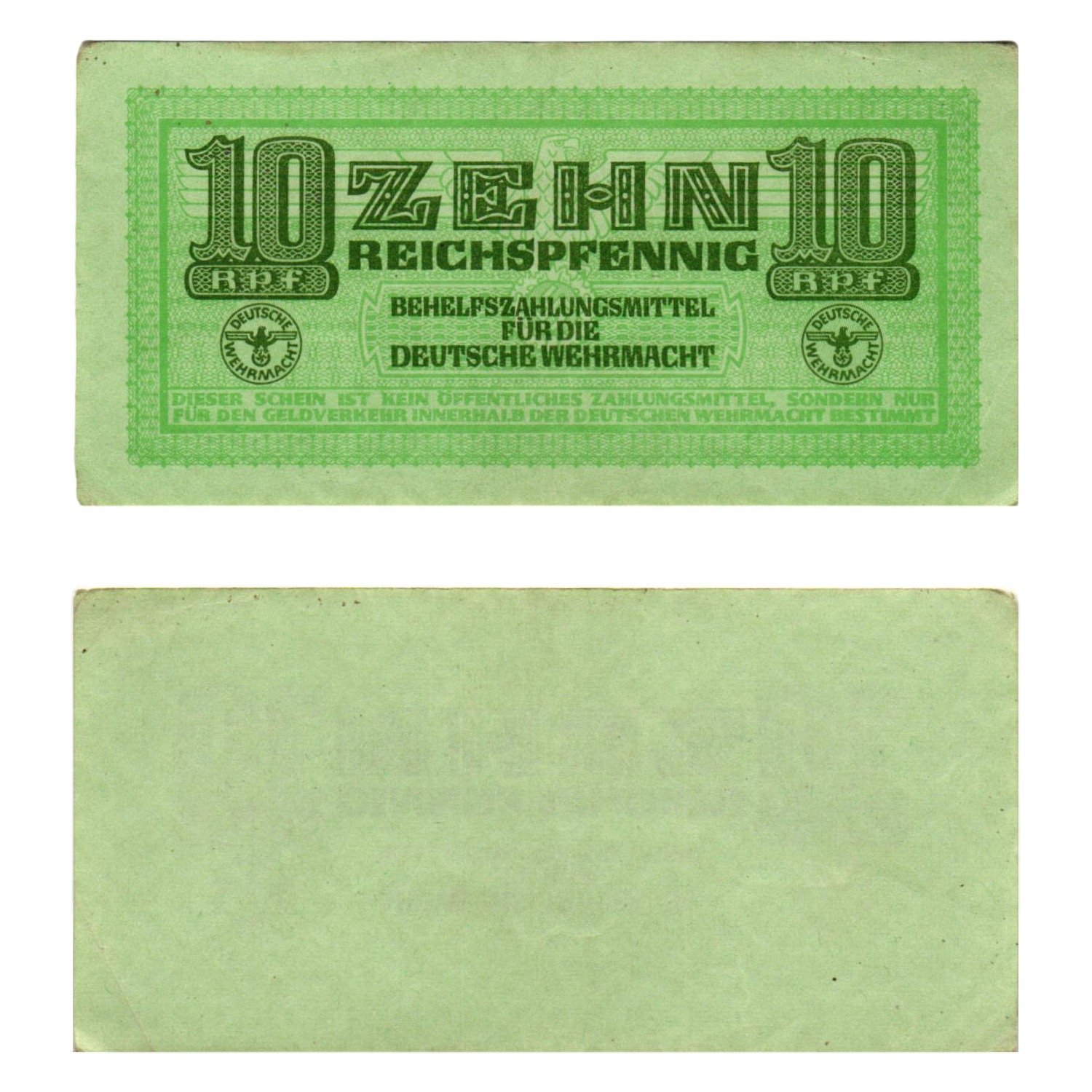 GERMANY 10 reichspfennig ND(1942) / 3rd Reich / Deutsche Wehrmacht / WWII Military Issue / VF+