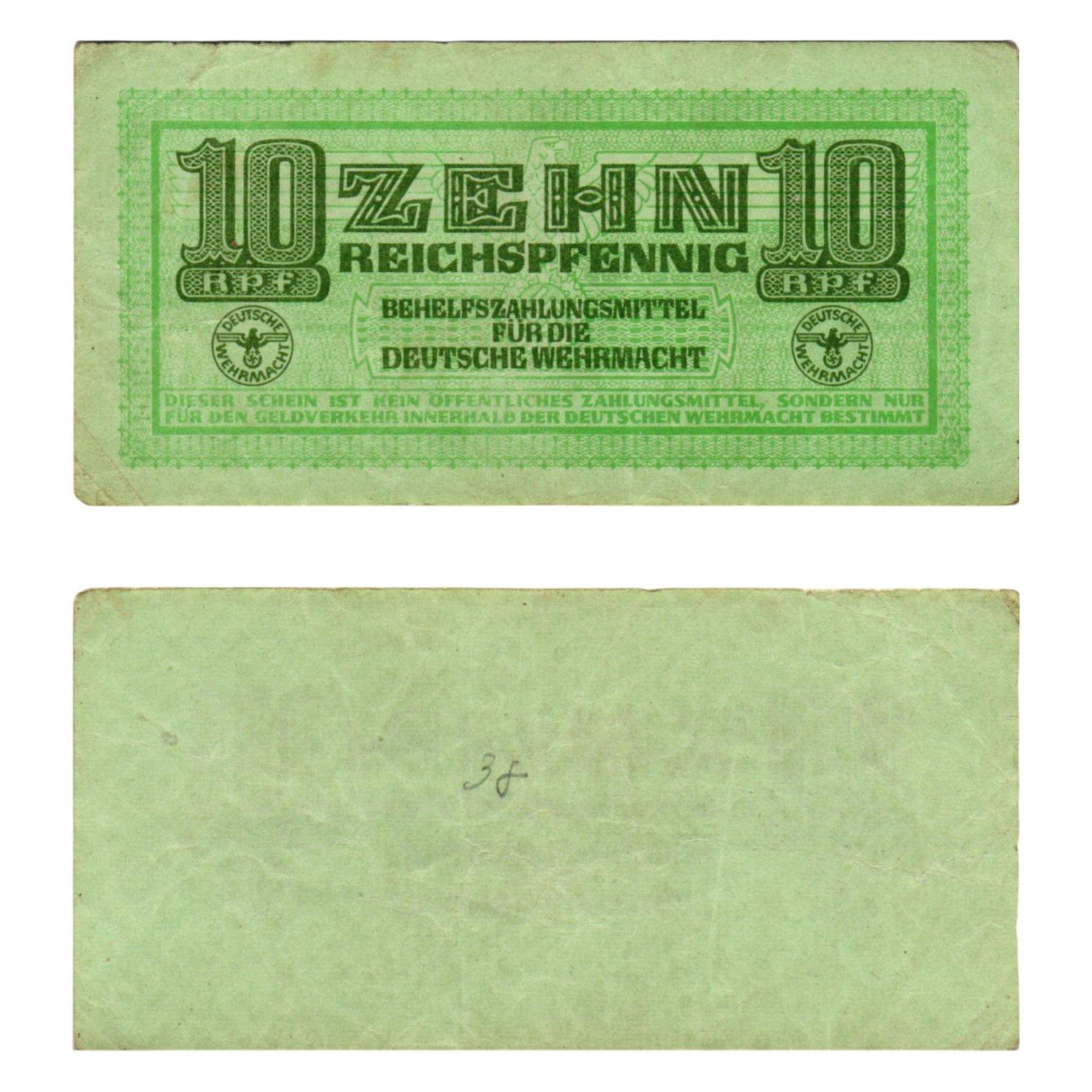 GERMANY 10 reichspfennig ND(1942) / 3rd Reich / Deutsche Wehrmacht / WWII Military Issue / VF