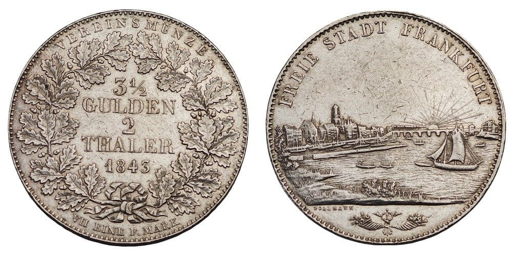 GERMANY 3 1/2 gulden – 2 thaler 1843 / Frankfurt / Silver / XF