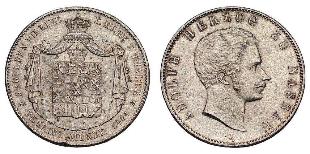 GERMANY 3 taler 1854 / Nassau / Silver / VF+