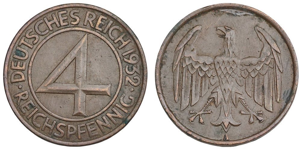 GERMANY 4 reichspfennig 1932A / Weimar Republic / VF