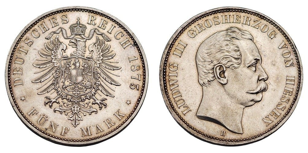GERMANY 5 mark 1875H / Hessen / Silver / UNC