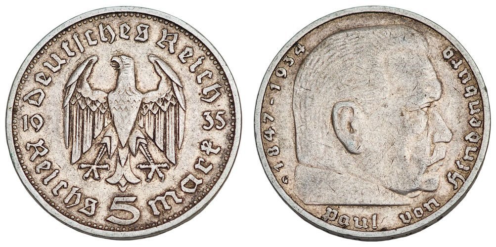 GERMANY 5 reichsmark 1935A / 3rd Reich / Paul von Hindenburg / Silver / VF