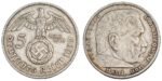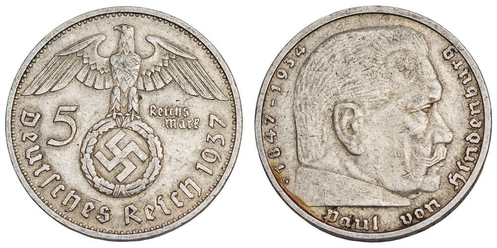 GERMANY 5 reichsmark 1937G / 3rd Reich / Paul von Hindenburg / Silver / VF