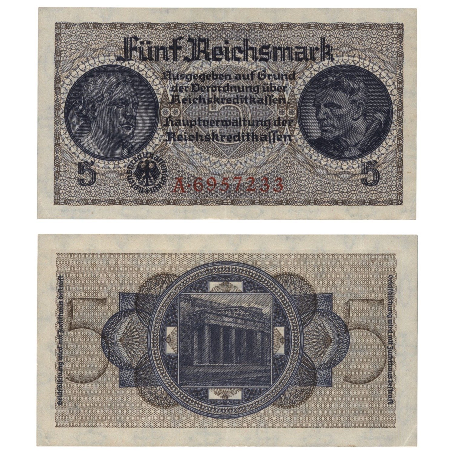 GERMANY 5 reichsmark ND(1940-1945) / 3rd Reich / Reichskreditkassenschein / WWII issue / XF