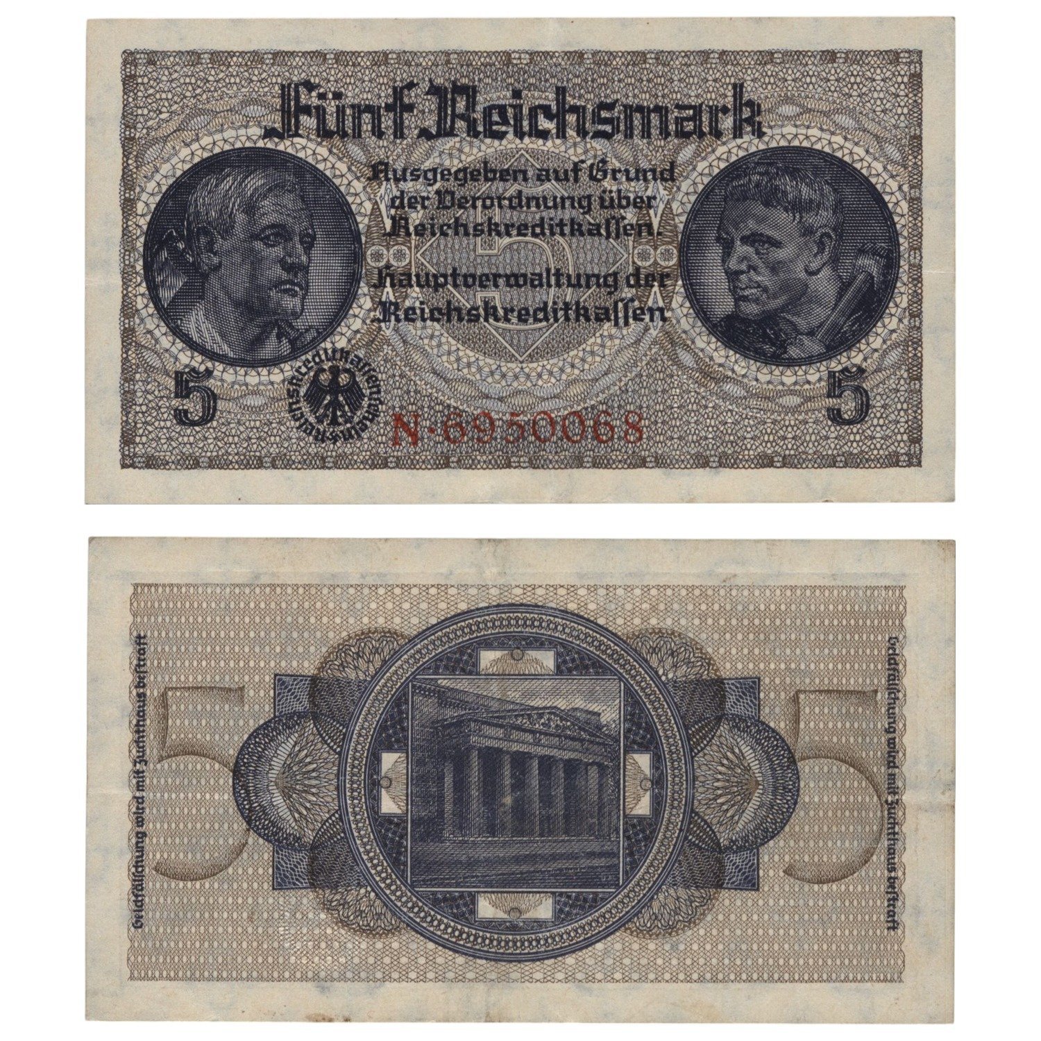 GERMANY 5 reichsmark ND(1940-1945) / 3rd Reich / Reichskreditkassenschein / WWII issue / XF