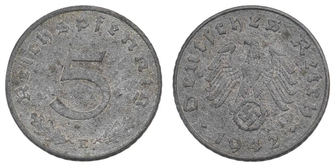 GERMANY 5 reichspfennig 1942E / 3rd Reich / WWII issue / VF