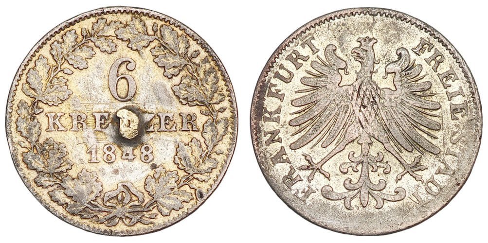 GERMANY 6 kreuzer 1848 / Frankfurt / Silver / used as jewelry / VG