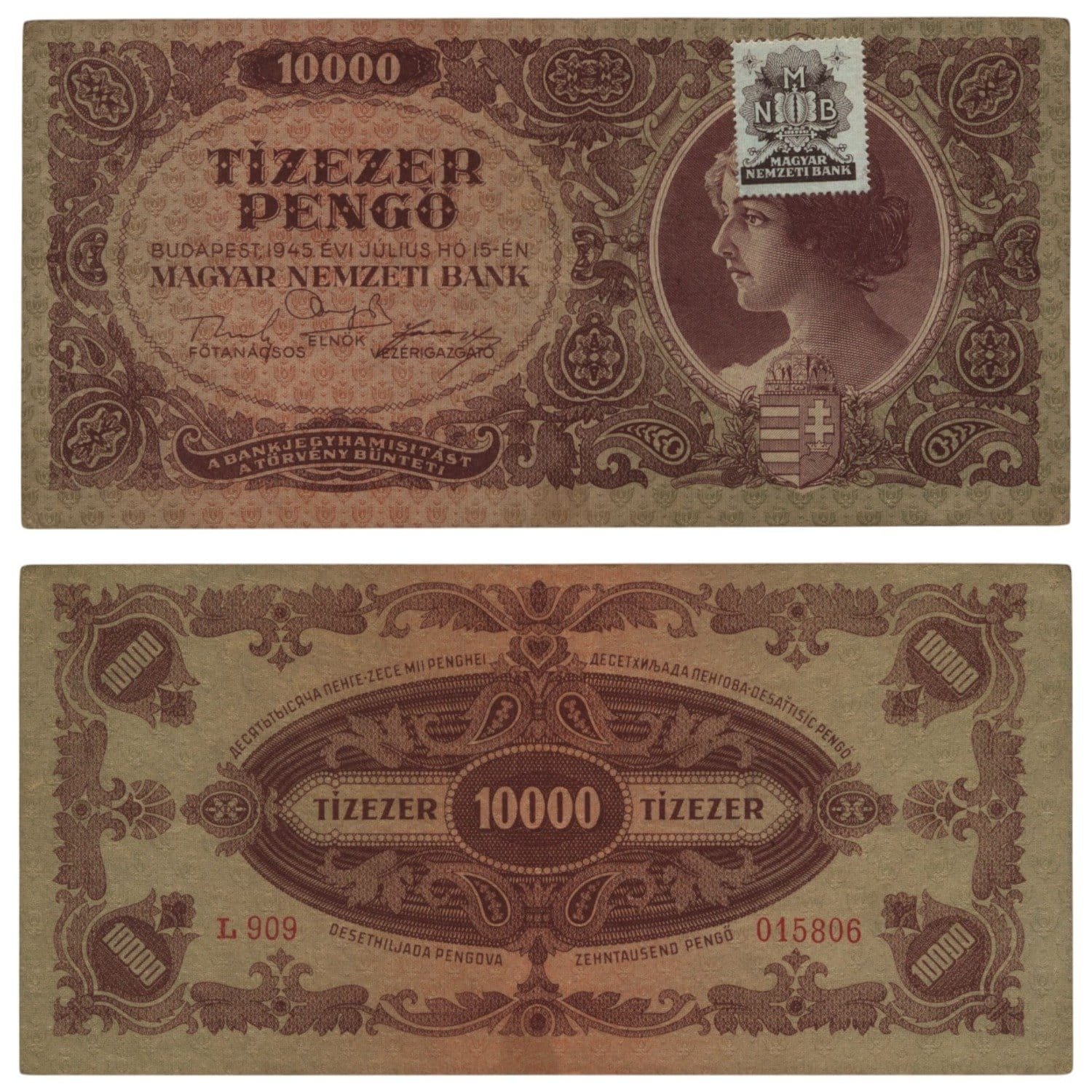 HUNGARY 10000 pengo 1945 / With adhesive stamp / VF+