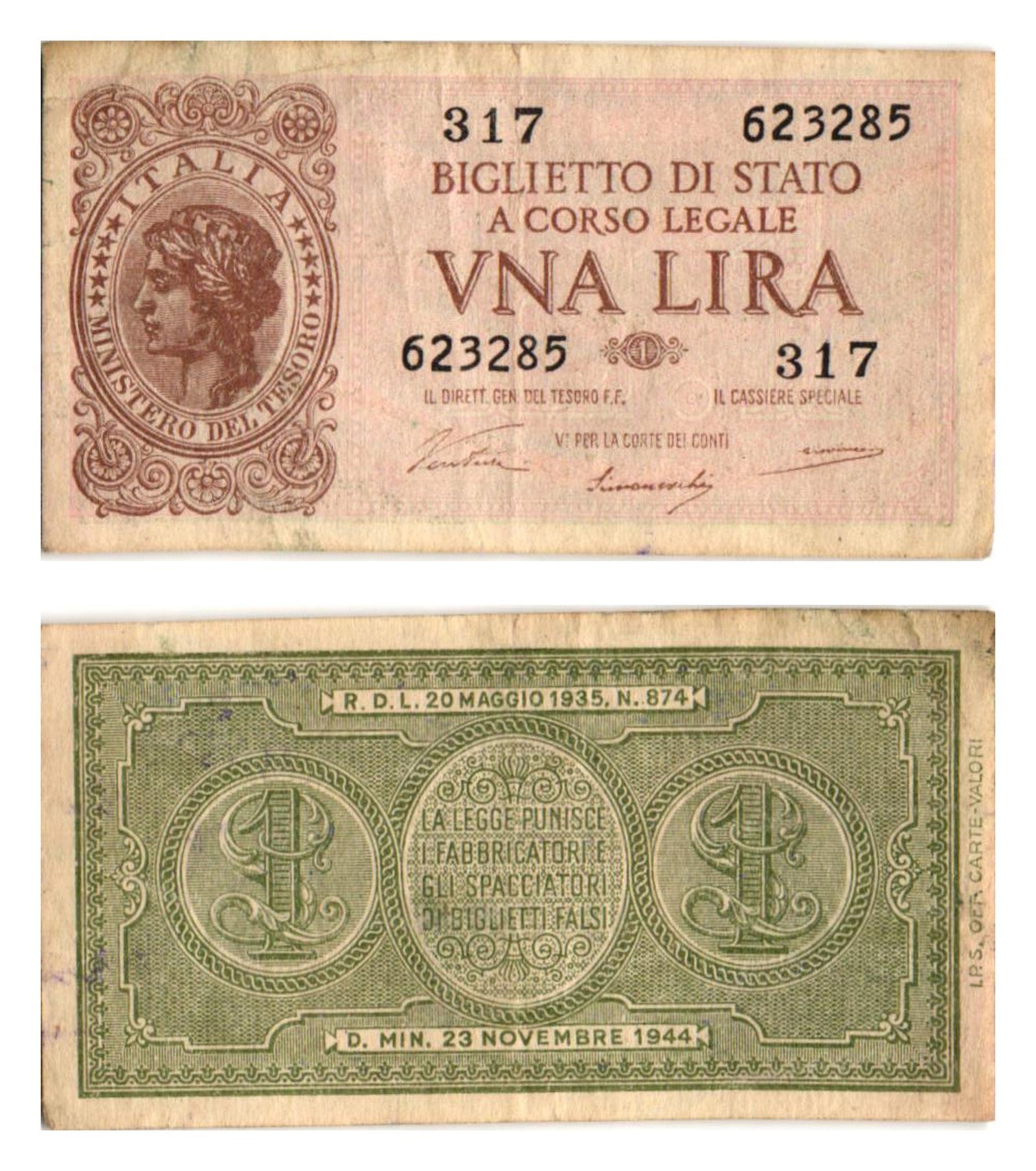 ITALY 1 lira 1944 VF