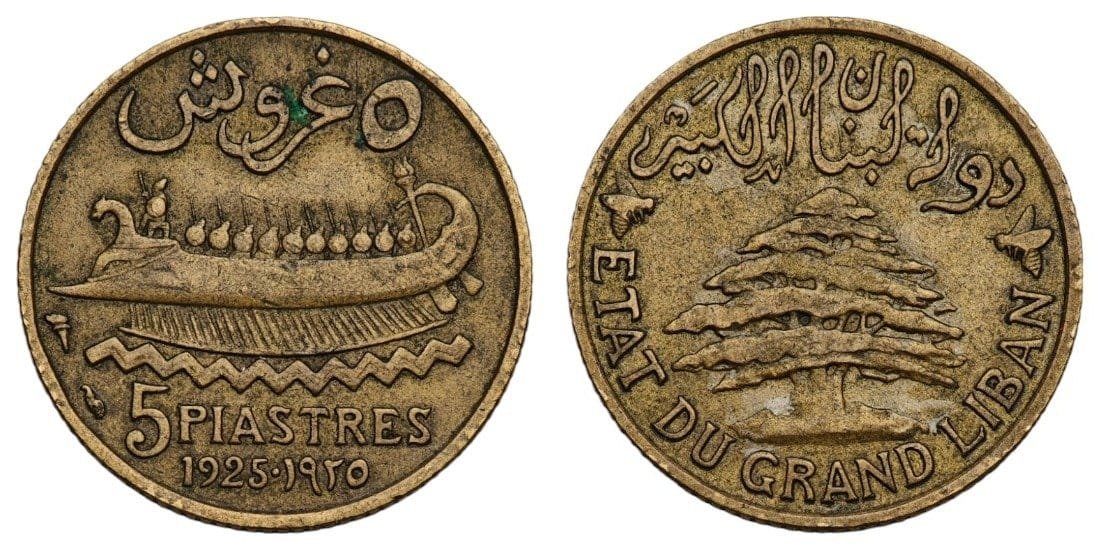 LEBANON 5 piastres 1925 / torch to the left / VF