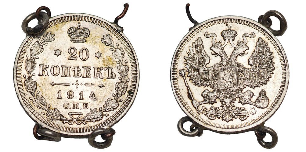 RUSSIA 20 kopeks 1914 / Empire / Silver / used as jewelry / VG