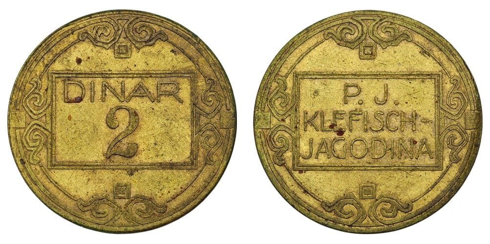 SERBIA 2 dinara ND(1918-1941) / Jagodina / P.J. Klefiš Company token / VF