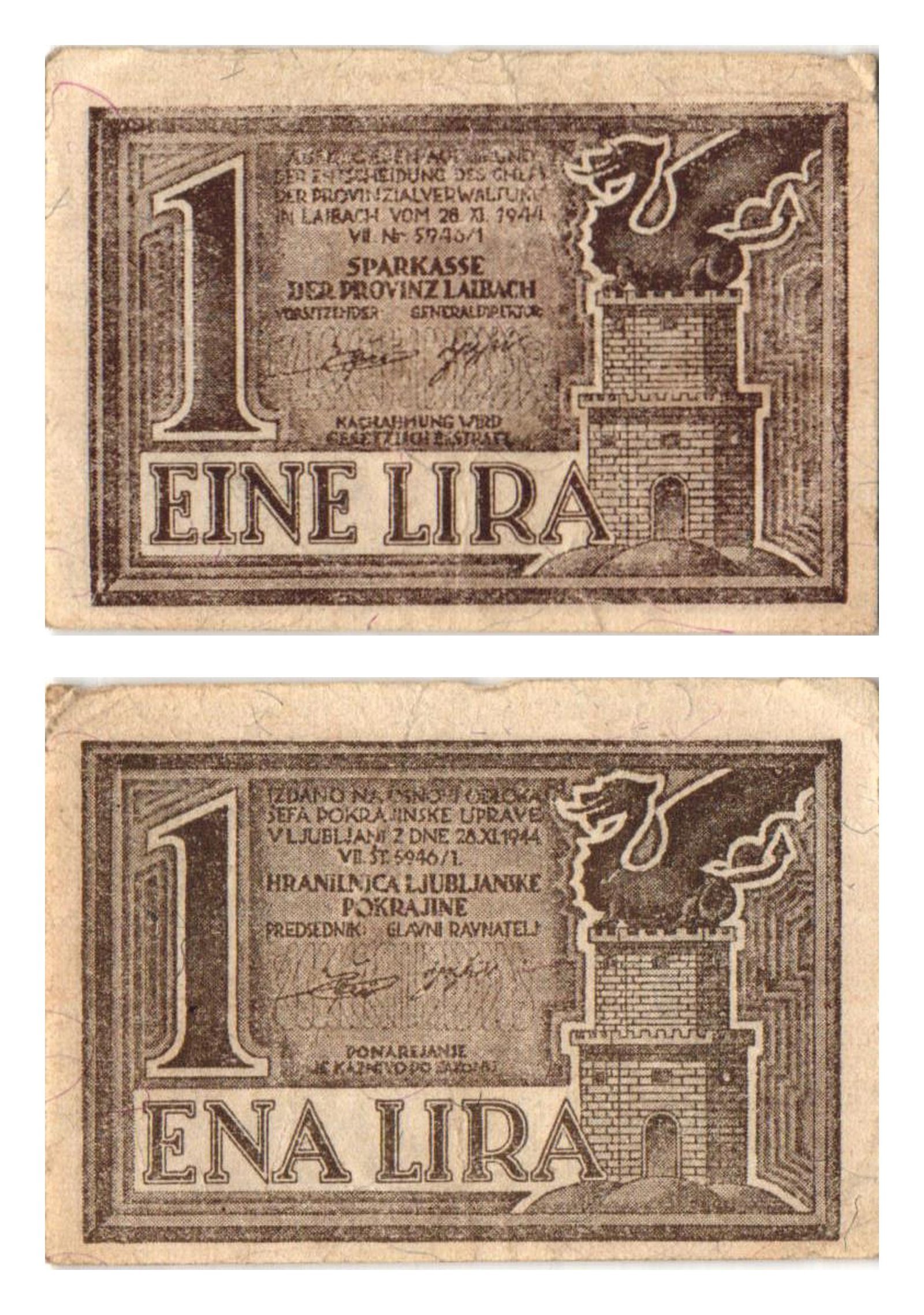 SLOVENIA 1 lira 1944 / Ljubljana Province issue / pinhole / VF-