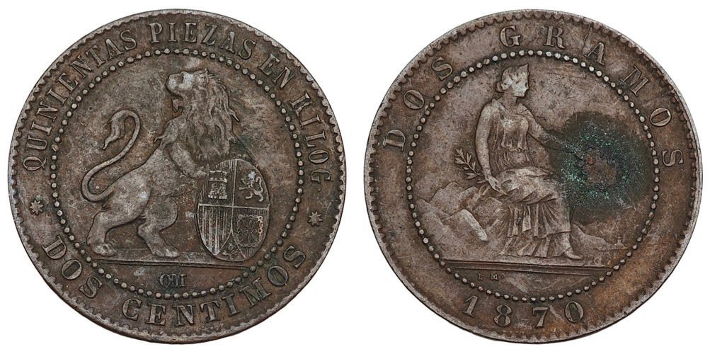SPAIN 2 centimos 1870 VF-
