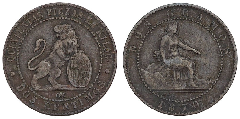 SPAIN 2 centimos 1870 VF