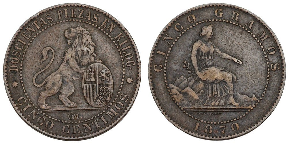 SPAIN 5 centimos 1870 VF