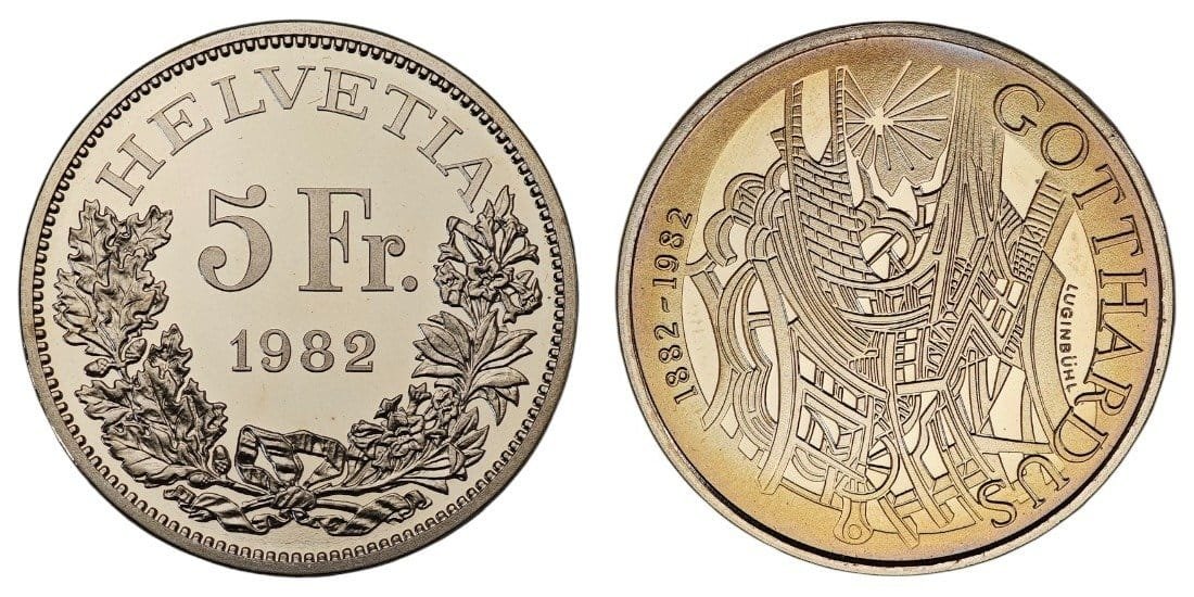 SWITZERLAND 5 francs 1982 / 100th Anniversary of the Opening of the Gotthard Railway / Proof