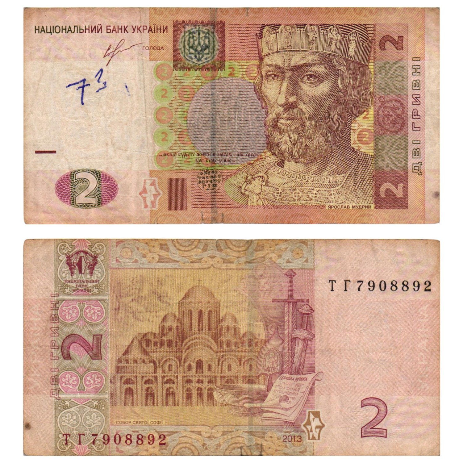 UKRAINE 2 hryvnia 2013 / minor tear / VF-