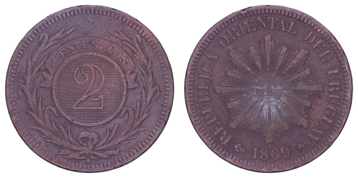 URUGUAY 2 centesimos 1869 VF-