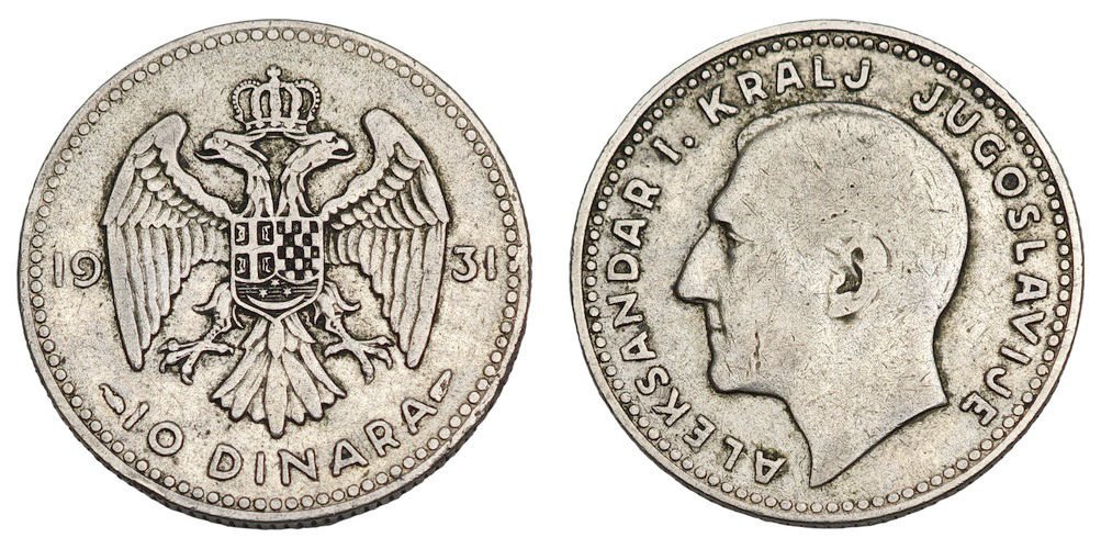 YUGOSLAVIA 10 dinara 1931 / Paris mint / Silver / VF