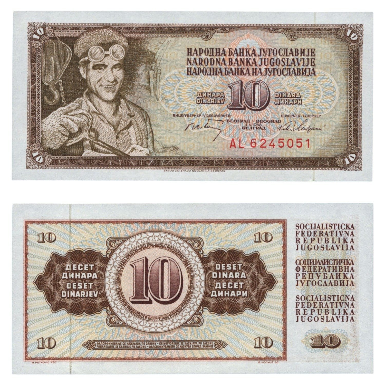 YUGOSLAVIA 10 dinara 1968 / AL series / 7 digits / UNC