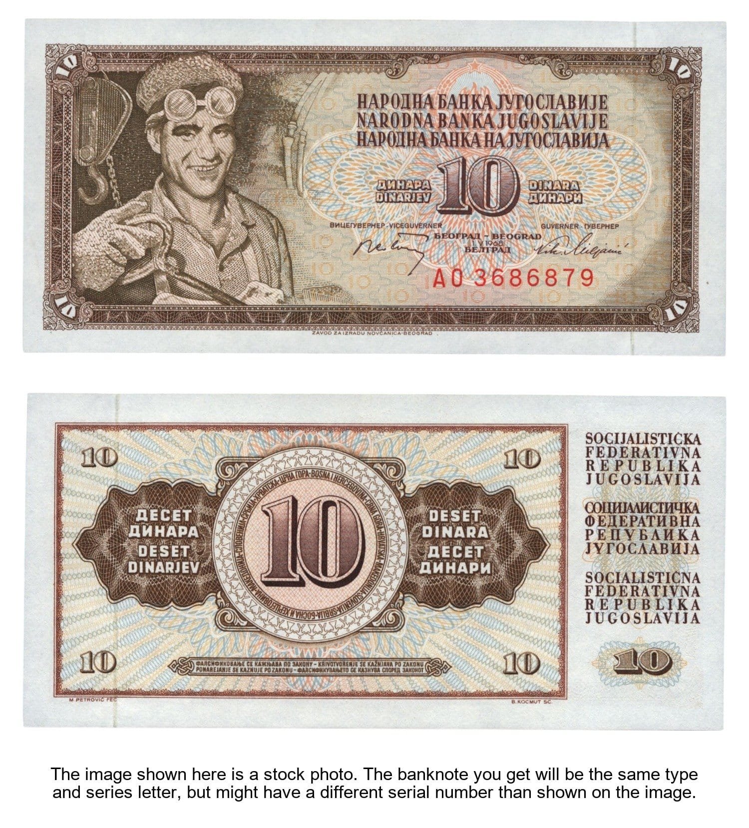 YUGOSLAVIA 10 dinara 1968 / AO series / 7 digits / UNC