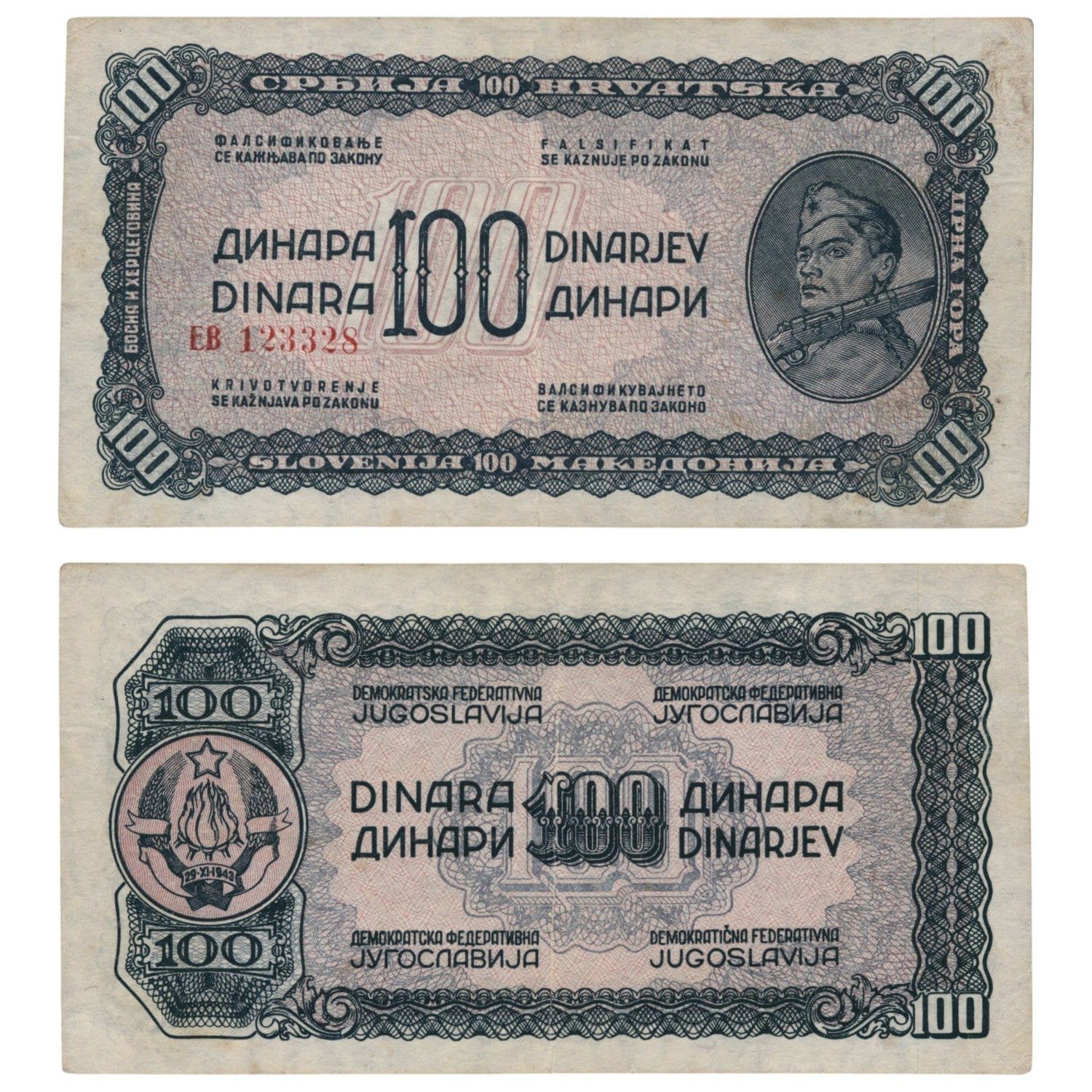 YUGOSLAVIA 100 dinara 1955 / Green-blue color with light underprint / Small serial # / VF+