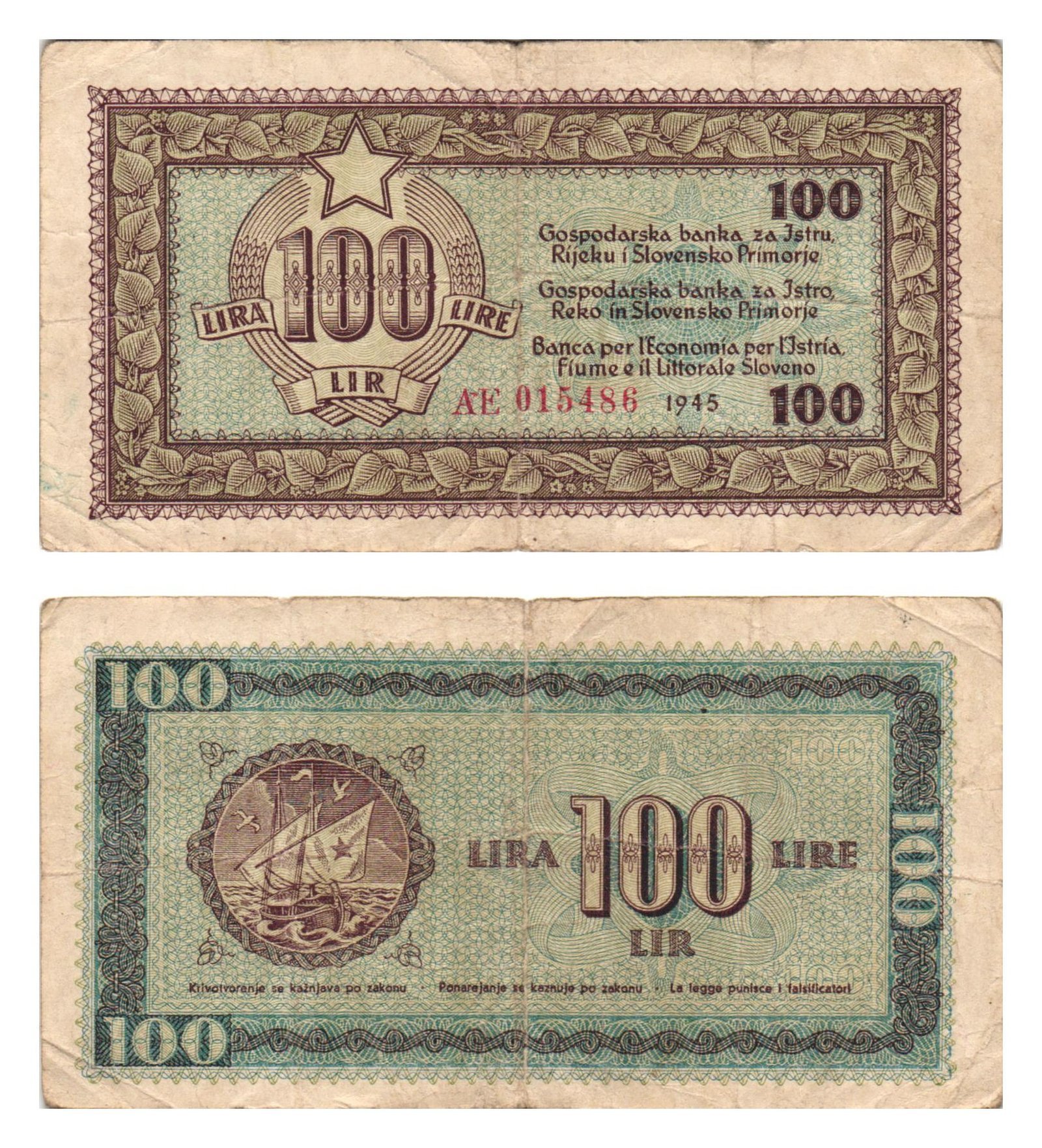 YUGOSLAVIA 100 lira 1945 / Economy Bank for Istra, Rijeka and Slovenian Littoral Region / VF
