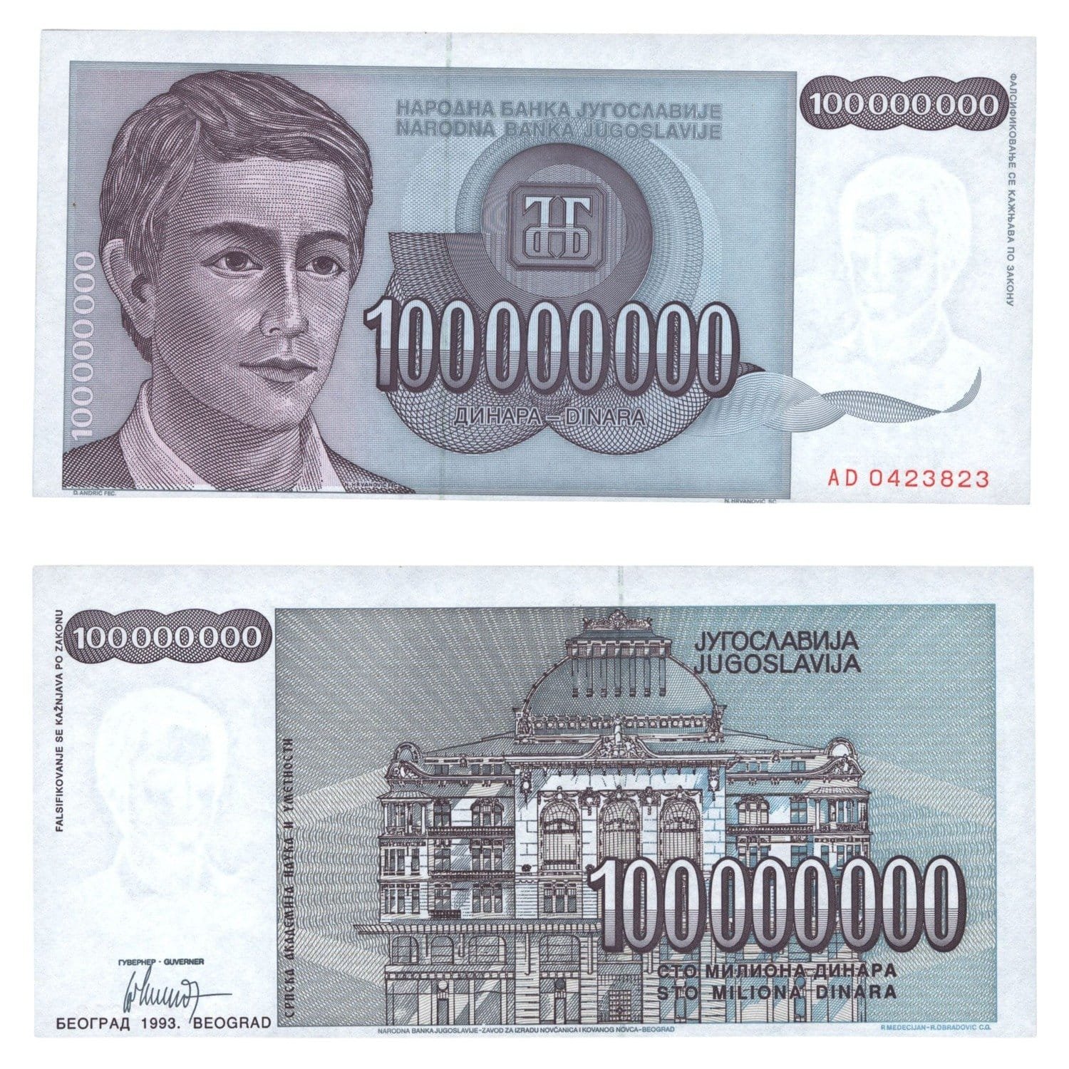 YUGOSLAVIA 100 million dinara 1993 / Error in printing / Design not centred / UNC