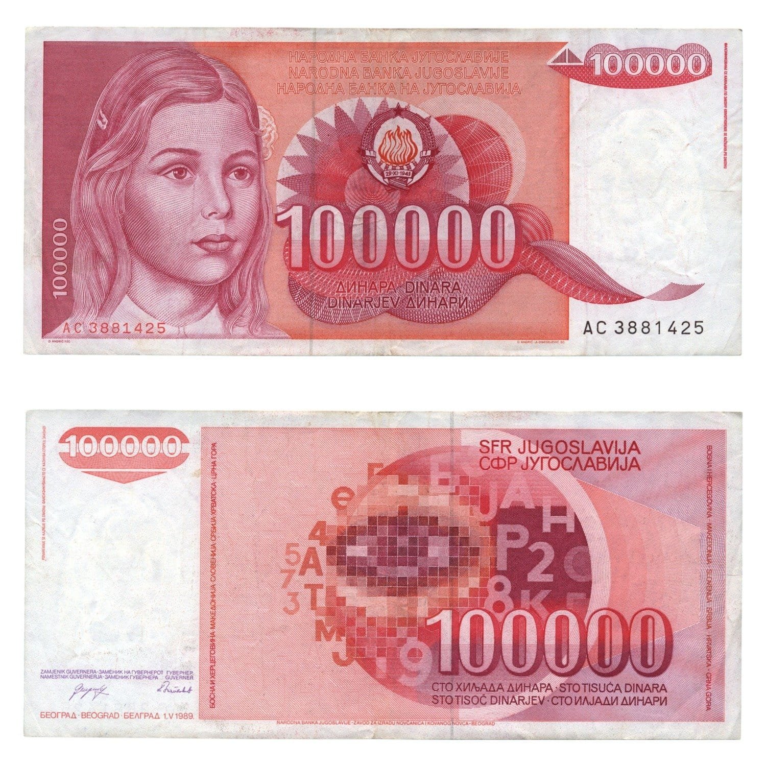 YUGOSLAVIA 100000 dinara 1989 / AC series / VF+