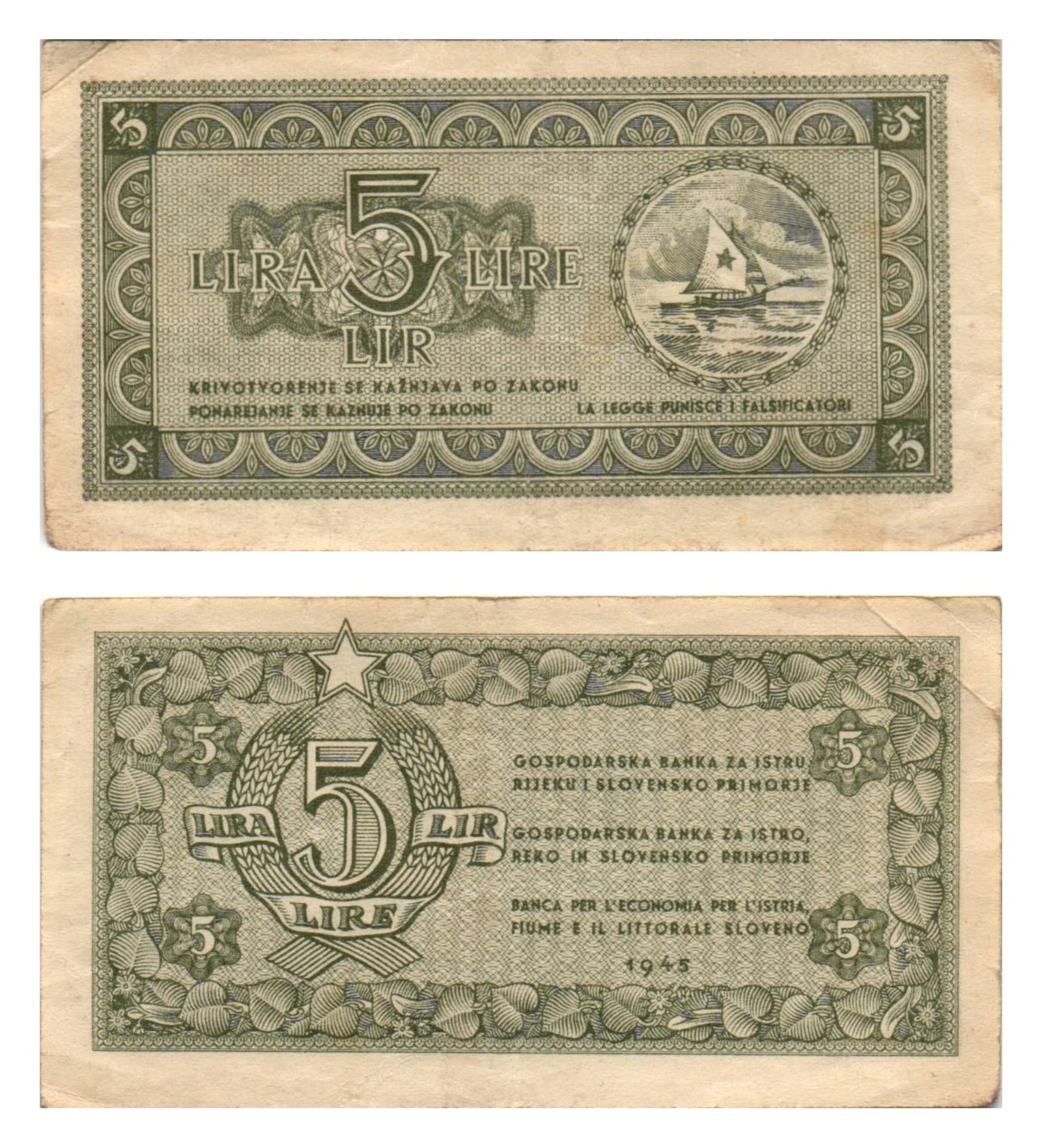 YUGOSLAVIA 5 lira 1945 / Economy Bank for Istra, Rijeka and Slovenian Littoral Region / VF