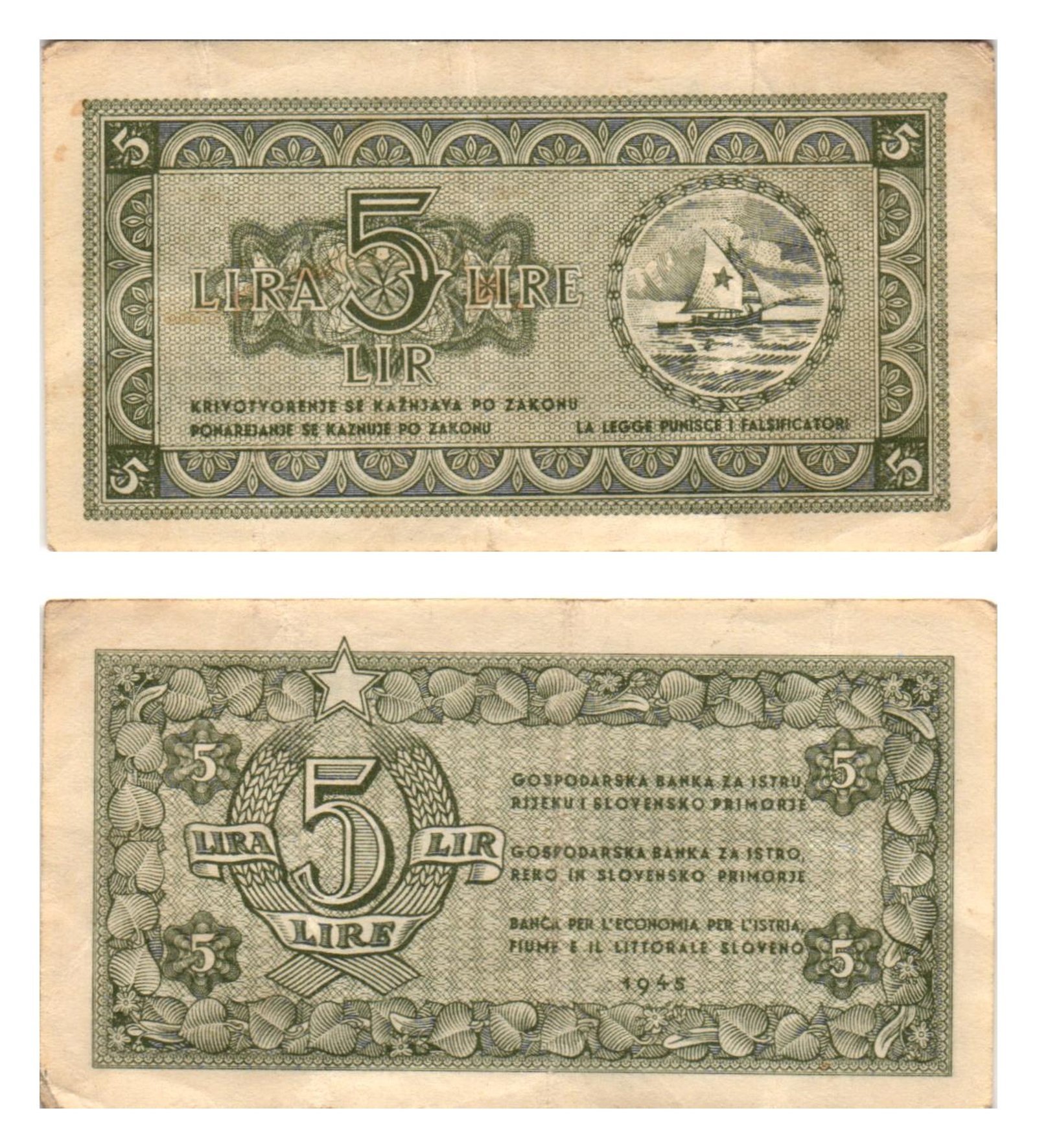 YUGOSLAVIA 5 lira 1945 / Economy Bank for Istra, Rijeka and Slovenian Littoral Region / VF